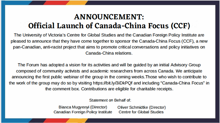 July 22, 2021 — The University of Victoria’s Centre for Global Studies and the Canadian Foreign Policy Institute are pleased to announce that they have come together to sponsor Canada-China Focus (CCF), a new pan-Canadian, anti-racist project that aims to promote critical conversations and policy initiatives on Canada-China relations.